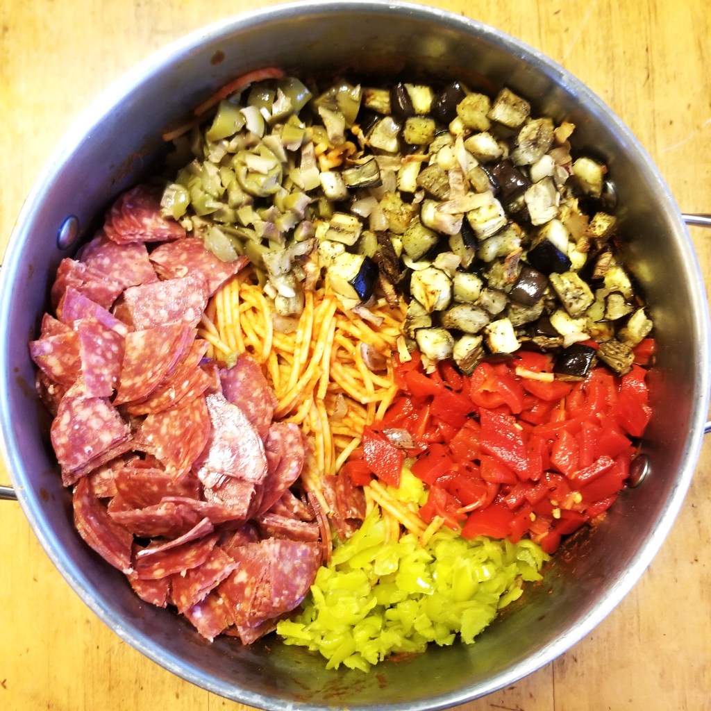 Chop the roasted red bell peppers, olives, pepperoncini peppers, and pepperoni.