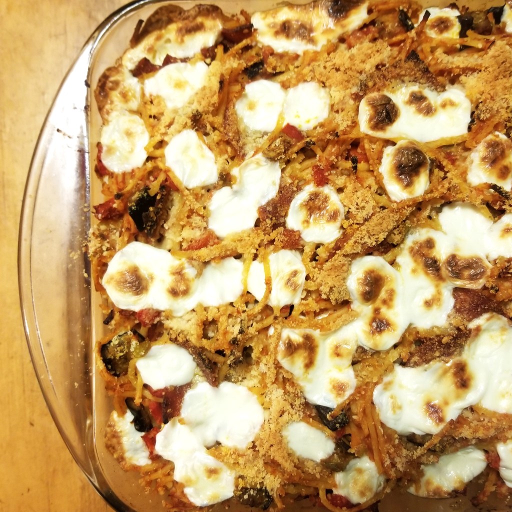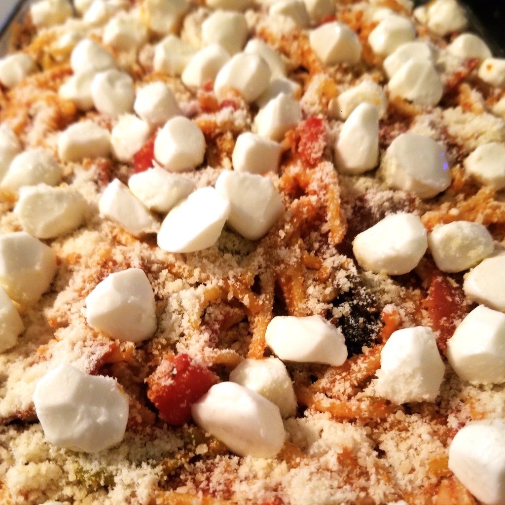 Sprinkle with parmesan cheese and dot with mozzarella pearls. Bake at 350 for 25 minutes, then broil for 3-5 until the top is golden.