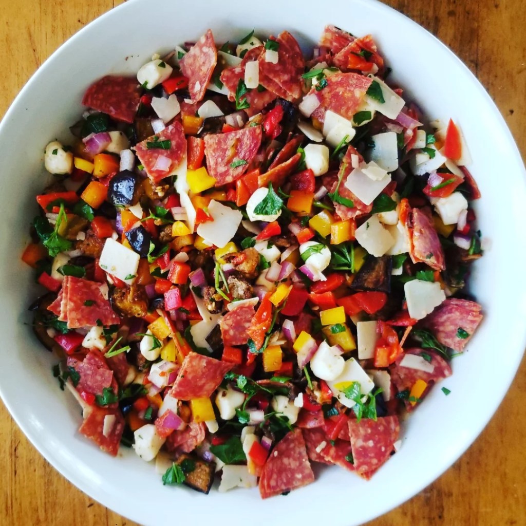 Chop the pepperoni into quarters. Chop the bell peppers (fresh and roasted), onion, and parsley. Once the eggplant is cooled, add to a large bowl with all other ingredients and toss together.