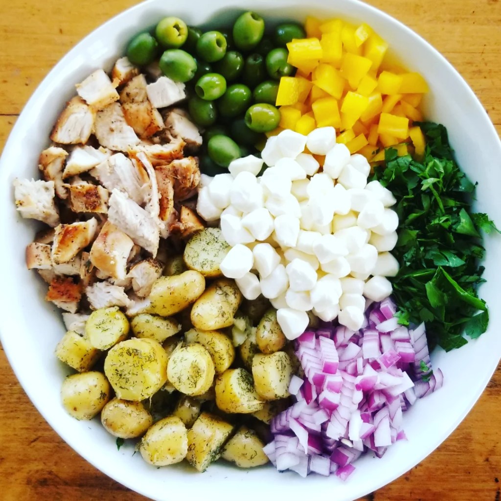 Wash the fingerling potatoes. Boil in salted water for about ten minutes, just until fork tender. Cool, chop into bite sized pieces. Toss with olive oil, a little Nature’s, and dill.