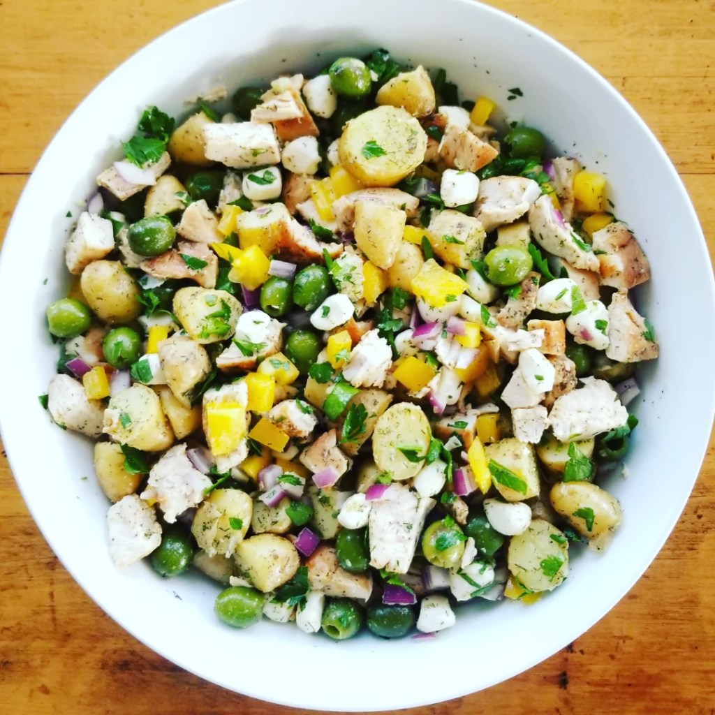 Season the chicken with Nature’s Seasoning and sear until cooked through in a pan with olive oil. Let cool and chop into bite sized pieces.